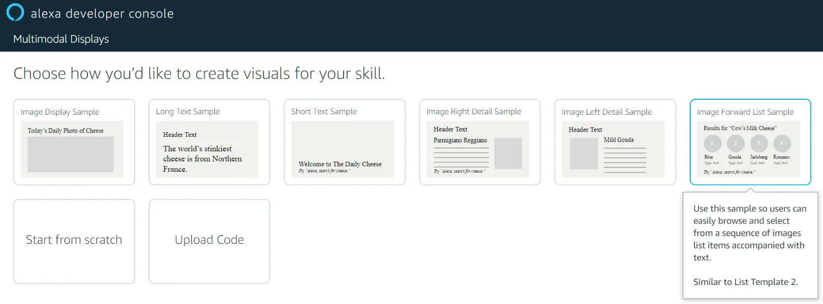 The way I did this was through the APL Authoring Tool. This handy tool provides a list of different visual designs you can use as a baseline to create compelling visuals for your skill. It also allows you to save and upload layouts, so you can extract them to your skill code, or upload them if you make offline updates. For this use case, I started with the Image Forward List Sample, which is based on ListTemplate2.