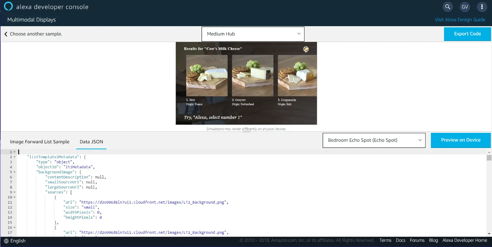 Once you’ve made changes within the Authoring Tool, you can select the Export Code button which will package up your layout and data files into one JSON file for you. I chose to use two different JSON files in my code, one called main which I used for the layout and another called datasources which I used for the data. I like keeping the separation of layout and content in my source code as a general best practice. It was surprising that Amazon’s Authoring Tool didn’t encourage this too.