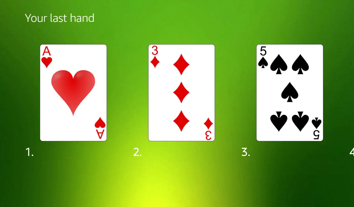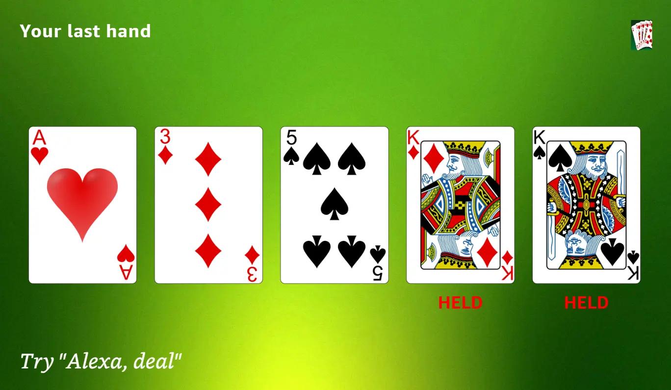 module.exports = { canHandle(handlerInput) { const request = handlerInput.requestEnvelope.request; // Was this a touch item selected? if (request.type === 'Alexa.Presentation.APL.UserEvent') { return ((request.source.type === 'TouchWrapper') && (request.source.handler === 'Press')); } return false; }, handle(handlerInput) { let index; const event = handlerInput.requestEnvelope; // Was this a touch item selected? if (event.request.type === 'Alexa.Presentation.APL.UserEvent') { const cards = event.request.arguments[0].split('.'); if (cards.length === 2) { index = cards[1]; } // Do something with the selected card...} },};With these changes, I had a much cleaner looking Video Poker skill, which is sure to delight my customers more than the older format I was using. I’ve just started scratching the surface in terms of APL’s capabilities. But I can tell it will open up a new world of possibilities for voice-driven multimodal skills! Let me know in the comments about your own learnings with this new framework.