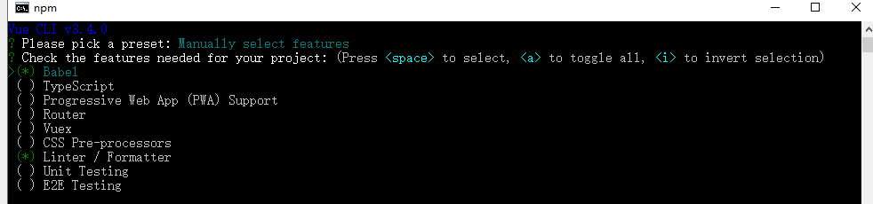 npm install -g @vue/cli-initvue init的运行效果将会跟vue-cli@2.x相同 vue init webpack my-project - 2,vue create project-name 也可以通过vue ui 可视化界面创建 键盘上下键选择 项目依赖