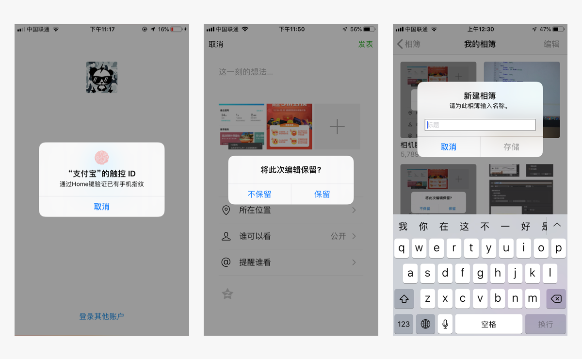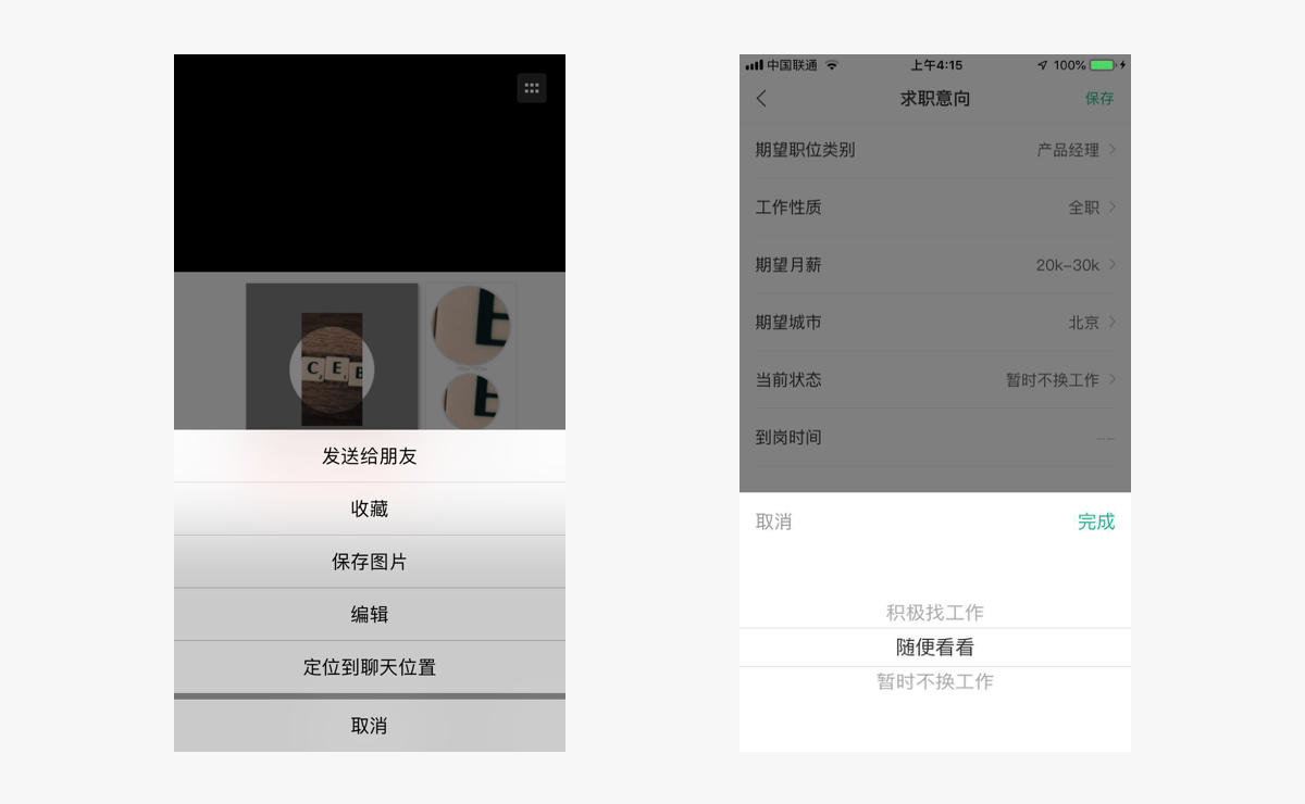 点击页面某个操作区域,触发此弹窗。提供一个临时操作窗口,可以选择多个功能选项。一般都有一个默认的“取消”按钮,点击“取消”或弹窗以外区域可以关闭弹窗。Aciton Sheets和Activity View是iOS上特有的交互形式。
