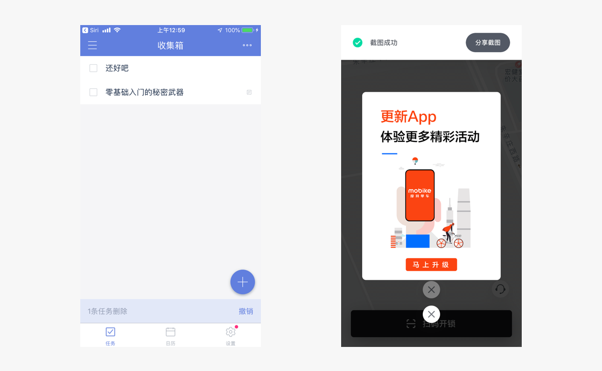大多数出现在屏幕底部,由文字和按钮组成,用户可以点击按钮进行交互。通常展示几秒钟后消失,也可以操作弹窗外其他位置而消失。偶尔也有未按照规范,出现在屏幕顶部的情况,如摩拜单车App。