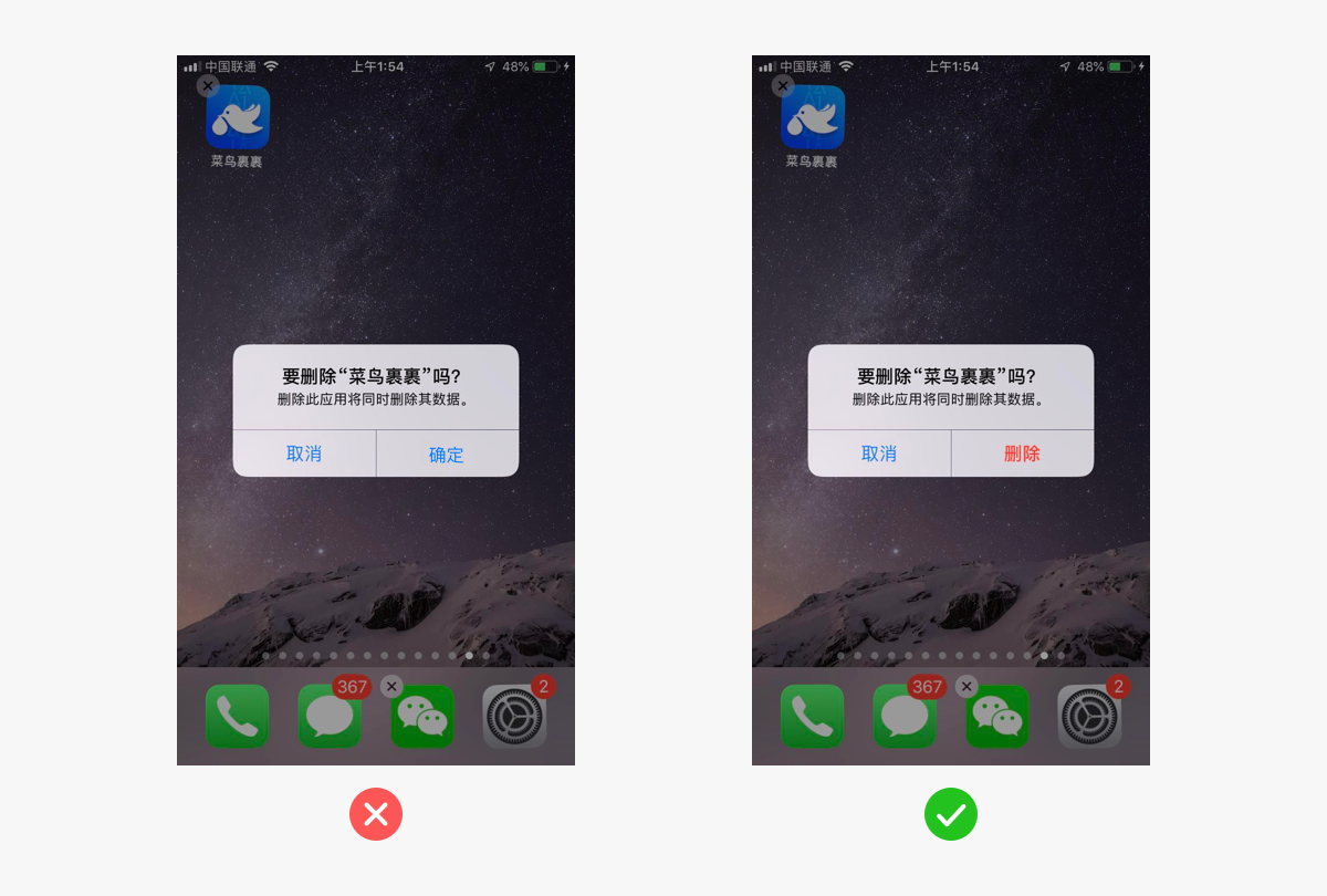 使用“删除”文案,而不是“确定”文案。虽然根据提示内容,一样可以知道“确定”就是删除App,但是不如使用“删除”文案更直接明了。甚至都不用看提示内容,也能明白操作按钮的含义,和点击后的结果。直接展示出操作名称更合适。