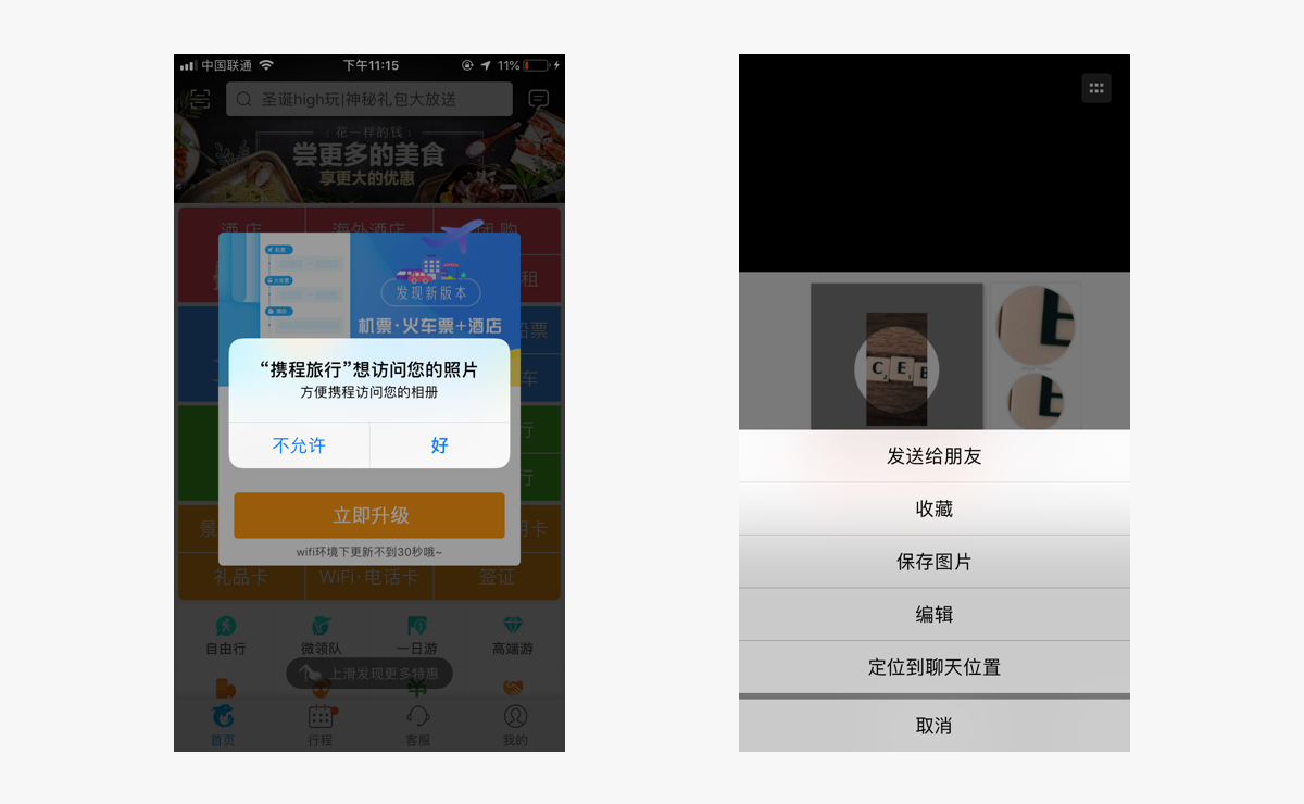 动作栏主要位于屏幕底部,背后有黑色半透明蒙层,可以提供多个功能选项,且展示的样式不固定。“Action Sheets”一般提供至少2个功能选项,顶部提示文案是可选模块。如果功能选项太多,可以使用“Acitivity View”滚动显示多个功能,注意需要保留一定的视觉线索。特殊情况下也可自行定义弹窗样式,来包含多个功能或复杂操作,以适应特殊场景。