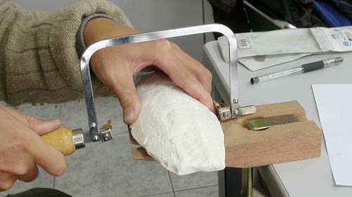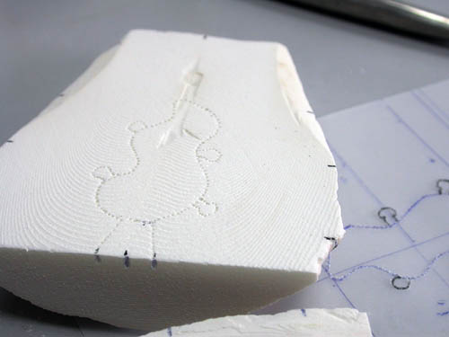 用尖锥子把草稿图案点戳到骨面上,边缘两直线是准备挖成浇铸口