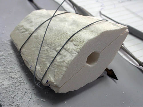 两片墨鱼骨挖好模穴之后,按记号线对准合起,用铁丝捆牢,准备浇铸
