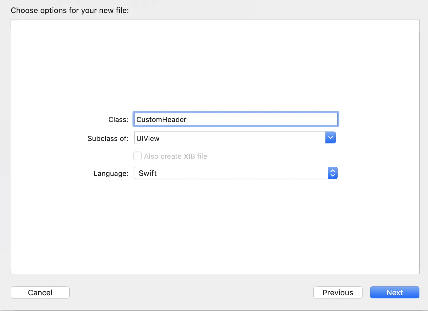 在Project导航器中,使用Cocoa Touch Class模板创建一个新文件。 将类命名为CustomHeader。 确保它是UIView的子类,语言是Swift。