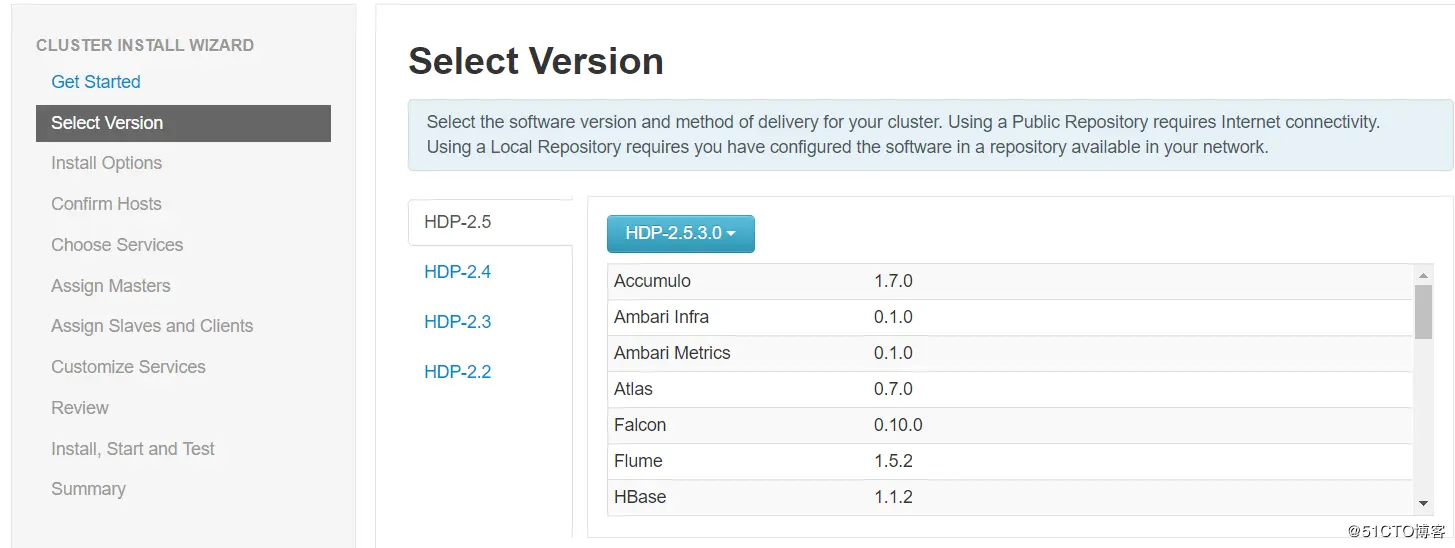 由于ambari的各个组件包很大,HDP大约快6G,我们采取离线安装方式,将ambari-server配置为yum源,事先在网上下载HDP、HDP-UTILS和Ambari 软件版本: