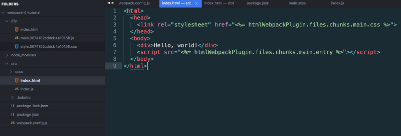 我们将使用在 HTML 模板中描述的 htmlWebpackPlugin.files.chunks.main。查看我们在 ./dist 下的文件 index.html。