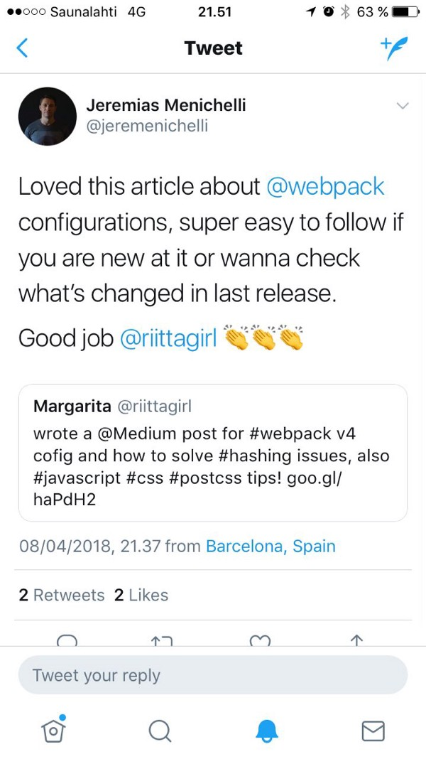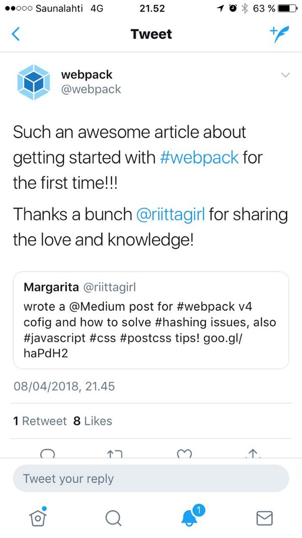 感谢各位对我的教程提出大量的反馈。我要很自豪的说,Webpack 前几天在 Twitter 上推荐了这篇教程,并且它已经得到了一些贡献者的认可!