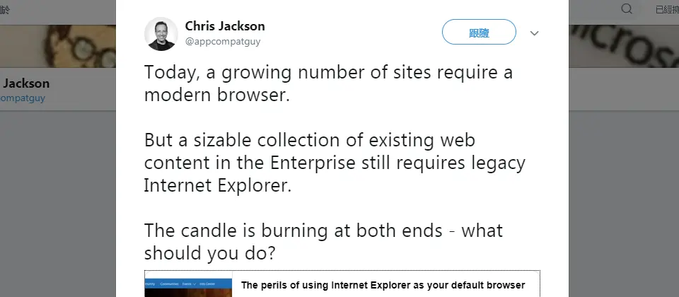 在Edge出现4年后,微软Internet Explorer (IE)至今仍然拥有铁粉,不过微软倒是奉劝这些铁粉使用IE是有风险的,但另一方面又强调并不是要用户舍弃IE。IE过去常因漏洞多、效能低落为人诟病,微软才于Windows 10时代推出Edge,但微软比较在意IE已经和新Web App及网页不兼容。微软体验与装置部门首席计划经理Chris Jackson在一篇名为《使用IE作为预设浏览器的危险》部落格贴文中,细数为了因应不同时代写出的网页及不断更新的网页标准,IE做了许多事。例如早期IE支持「怪异模式」(quirks mode)和「标准模式」(standards mode),IE 8时增加了IE 8标准兼容模式,使外部网站默认以IE8标准排版,内部网站预设以IE7标准呈现。到了IE 11时代又加入企业模式(Enterprise Mode)以解决兼容性问题。