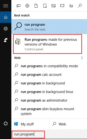 - 在任务栏搜索框中,在框中键入run program,然后单击Run Program made for previous versions of Windows