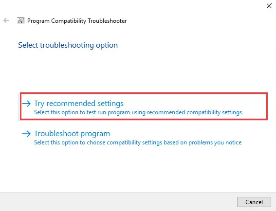 - 在Select troubleshooting option面板中,您可以选择Try recommended settings然后系统将帮助您自动处理问题