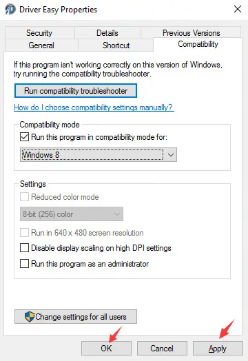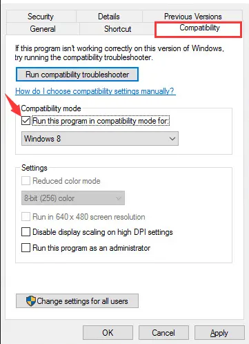 或者您可以转到应用程序的属性以更改兼容模式设置,以使程序正常工作。