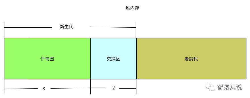 新生代还可以再细分,又可以分为两大块:伊甸园(Eden)和交换区(Survivor),默认占比是8:2,如下图所示: