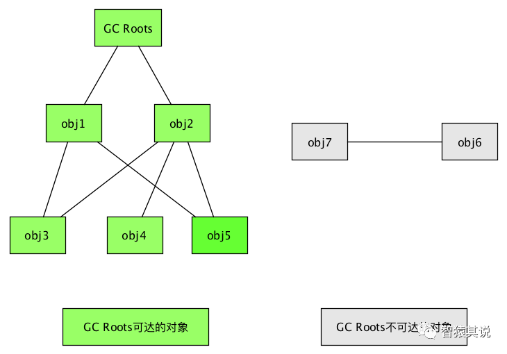 根搜索算法:通过一系列的名为“GC Roots”的对象作为起始点,从这些起始点开始向下搜索,搜索所走过的路径称为引用链,当一个对象不在任何引用链上时,则证明这个对象是不可用的(用图论的说法就是这个对象到GC Roots不可达)。如下图所示: