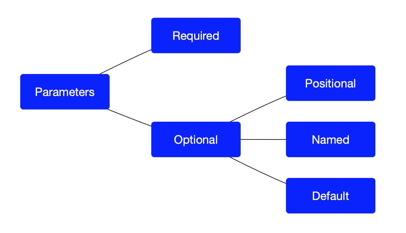 Dart 中的参数分为两种,必须的和可选的,可选参数又包含三种分别为 位置参数(Positional),具名参数(Named),