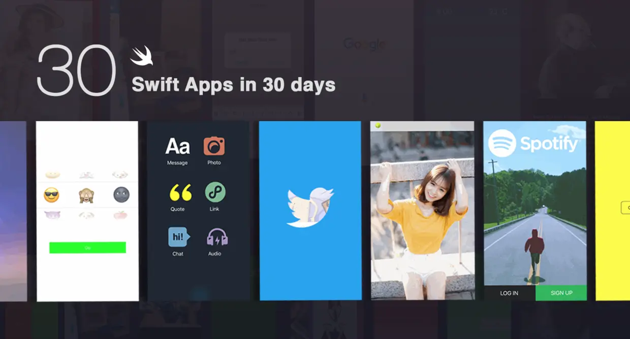 iOS开发已经做了快4年了,听说Swift也已经有两年多,但是一直都只是把学习停留在表面。无意中听说了有一个叫Sam Lu在Twitter上发起了一个100天做40个Swift小程序的活动,再加上国内看到了Allen_朝辉写的Swift学习的文章,心里暗自下了一个决定:30天写30个Swift小程序,希望能推动自己学习Swift的计划。这30个小程序难度不同,有的一个晚上就能写完,有的要占用周末大部分时间来细研究。大部分不会的东西Google都能找到,就算Swift版本没有找到Objective-C版本然后用Swift重写就好,好在他们对应关系比较明确。