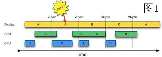 - 1.首先图的横轴是时间,纵轴从下到上分别表示:CPU 处理、GPU 处理、屏幕显示,这三个步骤也就是我们写的代码到图像显示在屏幕上的流程。