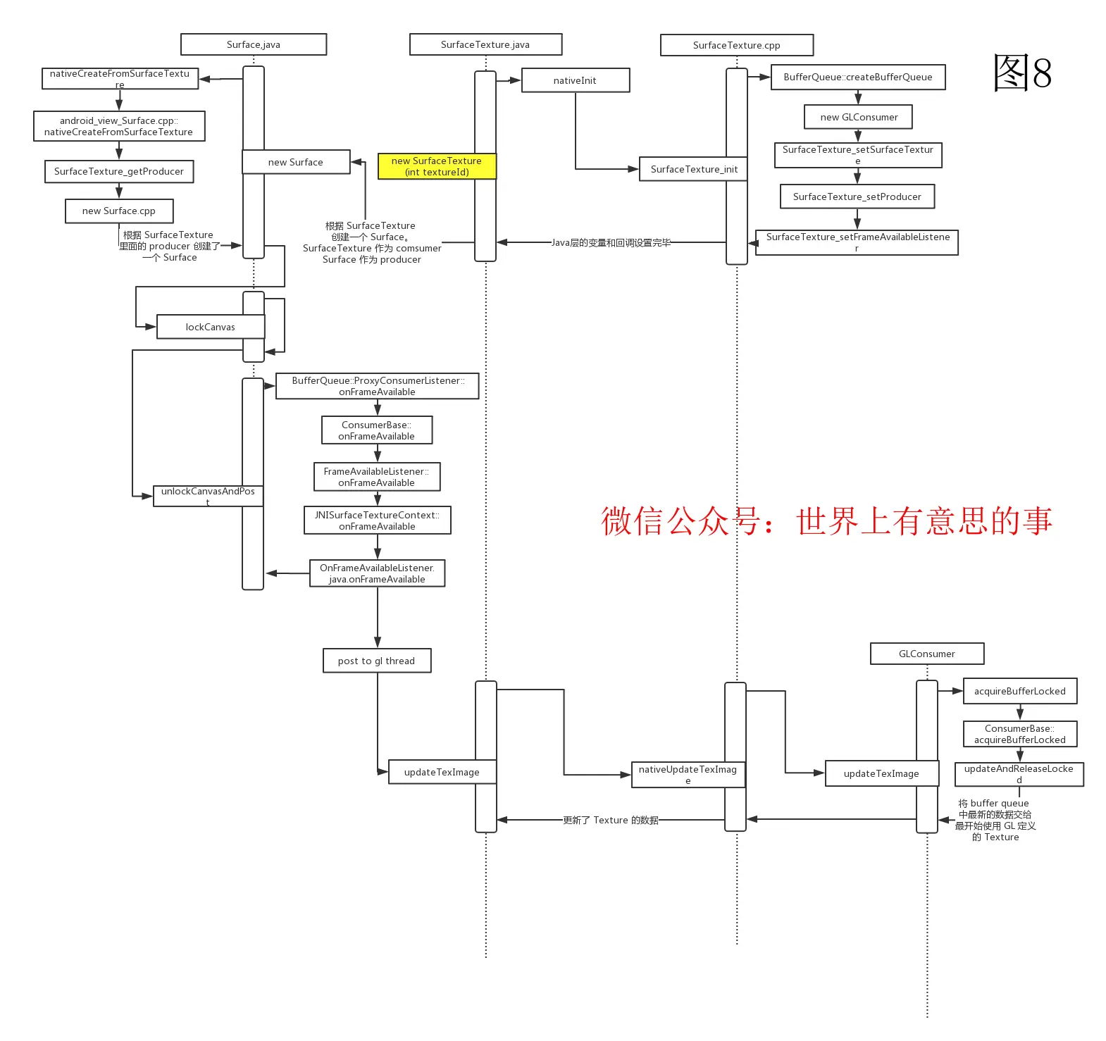 - 3.不管如何最终还是要调用 updateTexImage 的,我们再来看看它内部是怎么个实现。首先调用链是这样的:SurfaceTexture.updateTexImage——>SurfaceTexture::nativeUpdateTexImage——>GLConsumer::updateTexImage。GLConsumer::updateTexImage 中重要的步骤如下: