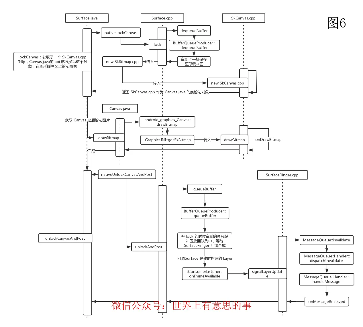 我们都知道 Surface 可以通过 lockCanvas 和 unlockCanvasAndPost 这两个 api 来再通过 Canvas 来绘制图像,这一节我就通过这两个 api 来讲讲 Surface 的绘制流程,整个流程如图6所示。