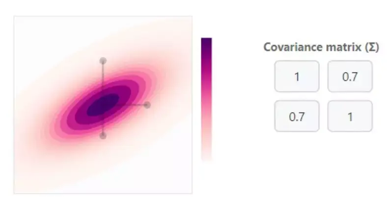 从图形上来看,该分布以均值为中心,由协方差矩阵决定其形状。下图展示了这些参数对于一个二维高斯分布的影响。每个随机变量的标准差在协方差矩阵的对角线上,而其它的值则显示了它们之间的协方差。