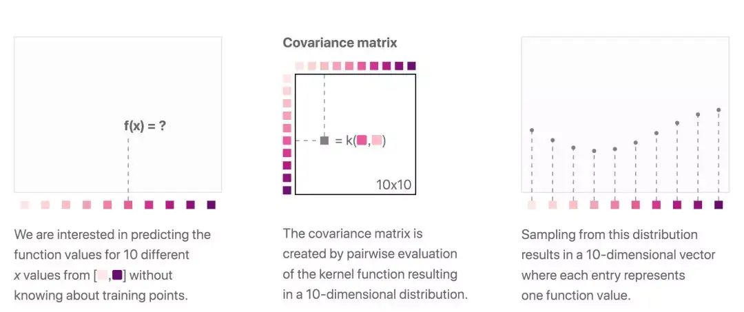 我们将测试点两两配对,在这个函数上求值以获取协方差矩阵,这个步骤在下图中也有所显示。为了对核函数的作用有一个更直观的理解,我们可以想一想协方差矩阵中元素描述的是什么。Σ_ij 描述的是第 i 个点和第 j 个点之间的相互影响,这和多元高斯分布的定义一致。在多元高斯分布的定义中,Σ_ij 定义了第 i 个随机变量和第 j 个随机变量之间的相关性。由于核函数描述的是函数值之间的相似度,它便控制了这个拟合函数可能拥有的形状。注意,当我们选择一个核函数时,我们要确保它生成的矩阵遵循协方差矩阵的属性。