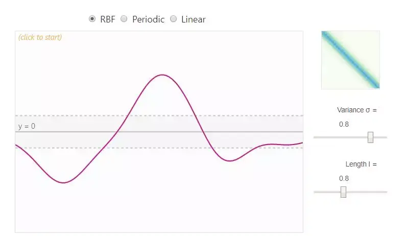 通过点击可以激活训练点,从而得到一个受到约束的分布。这个变化体现在协方差矩阵的内容里,并且会改变预测到的函数具有的均值和标准差。正如我们所料,在靠近训练数据的区域,预测的不确定性很小,离得越远,不确定性越大。