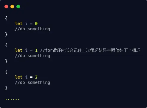 什么意思呢?简而言之就是每次循环都会声明一次(对比var声明的for循环只会声明一次),可以这么理解let/const中的for循环