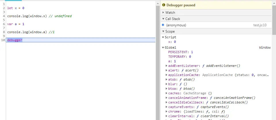 可以看到使用let声明的变量x是在一个叫script作用域下的,而var声明的变量因为变量提升所以提升到了全局变量window对象中,这使我们能放心的使用新语法,不用担心污染全局的window对象