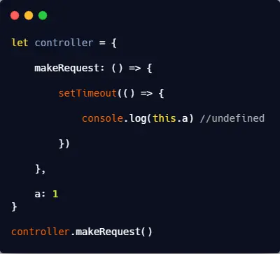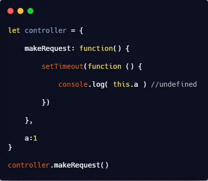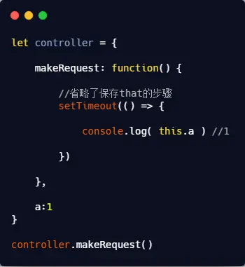 因为setTimeout会将一个匿名的回调函数推入异步队列,而回调函数是具有全局性的,即在非严格模式下this会指向window,就会存在丢失变量a的问题,而如果使用箭头函数,在书写的时候就已经确定它的this等于它的上下文(这里是makeRequest的函数执行上下文,相当于将箭头函数中的this绑定了makeRequest函数执行上下文中的this)因为是controller对象调用的makeRequest函数,所以this就指向了controller对象中的a变量
