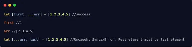 剩余运算符可以和数组的解构赋值一起使用,但是必须放在最后一个,因为剩余运算符的原理其实是利用了数组的迭代器,它会消耗3个点后面的数组的所有迭代器,读取所有迭代器生成对象的value属性,剩运算符后不能在有解构赋值,因为剩余运算符已经消耗了所有迭代器,而数组的解构赋值也是消耗迭代器,但是这个时候已经没有迭代器了,所以会报错