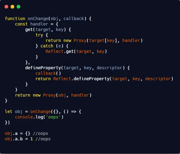 这样就实现了无论对象嵌套多少层,只要有属性进行赋值就会触发get方法,对这层对象进行代理,随后触发defineProperty执行callback回调函数