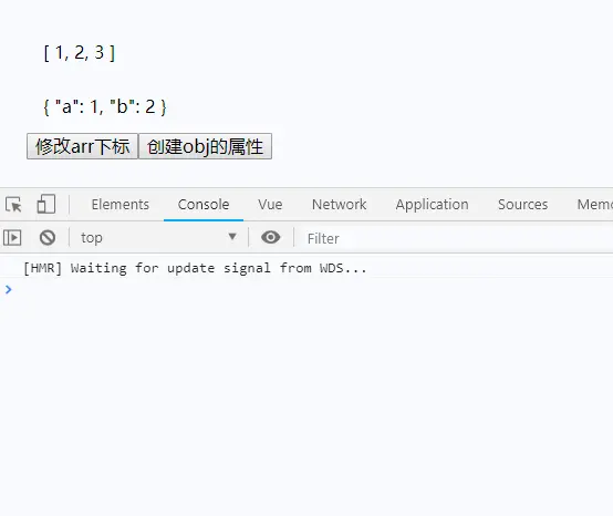 可以看到这里数据改变了,控制台打印出了新的值,但是视图没有更新,这是因为Vue内部使用Object.defineProperty进行的数据劫持,而这个API无法探测到对象根属性的添加和删除,以及直接给数组下标进行赋值,所以不会通知渲染watcher进行视图更新,而理论上这个API也无法探测到数组的一系列方法(push,splice,pop),但是Vue框架修改了数组的原型,使得在调用这些方法修改数据后会执行视图更新的操作