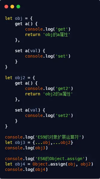 ES9支持在对象上使用扩展运算符,实现的功能和Object.assign相似,唯一的区别就是在含有getter/setter函数的对象的属性上有所区别