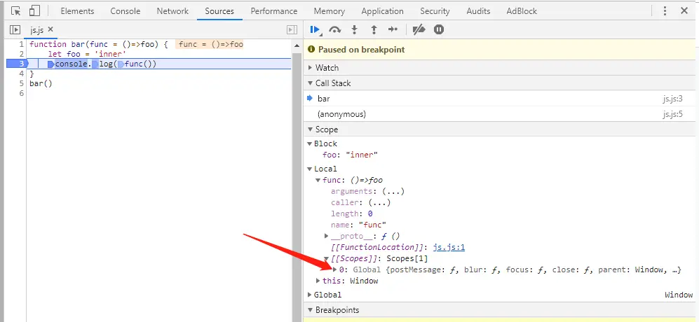 这个其实也是let/const的特点,ES6规定它们不属于顶层全局变量的属性,这里用chrome调试一下