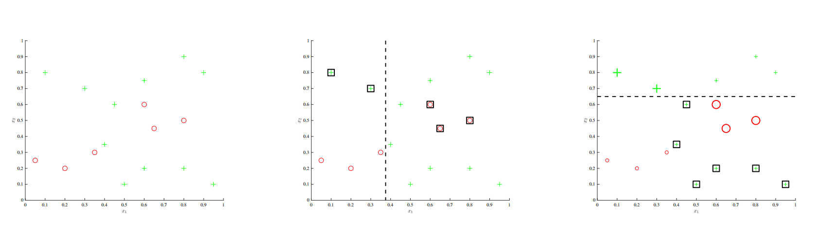 上面的例子可以用于直观理解一下推进法(Boosting)背后的思想.开始时是左边的数据及,然后进行单词决策树桩的训练,如中间图所示.关键思想是接下来要看那些样品被分类错了,然后增加他们和其他正确分类的样品相比的相对权重.然后在训练一个新的决策树桩,这个就会更倾向于将这些特殊值(hard negatives)进行正确的分类.然后继续这样,逐渐在每一步中对样品重新评估权重,最后输出的就是一系列这些弱学习模型(weak learners)的结合,就是一个集成分类器(classier)了.
