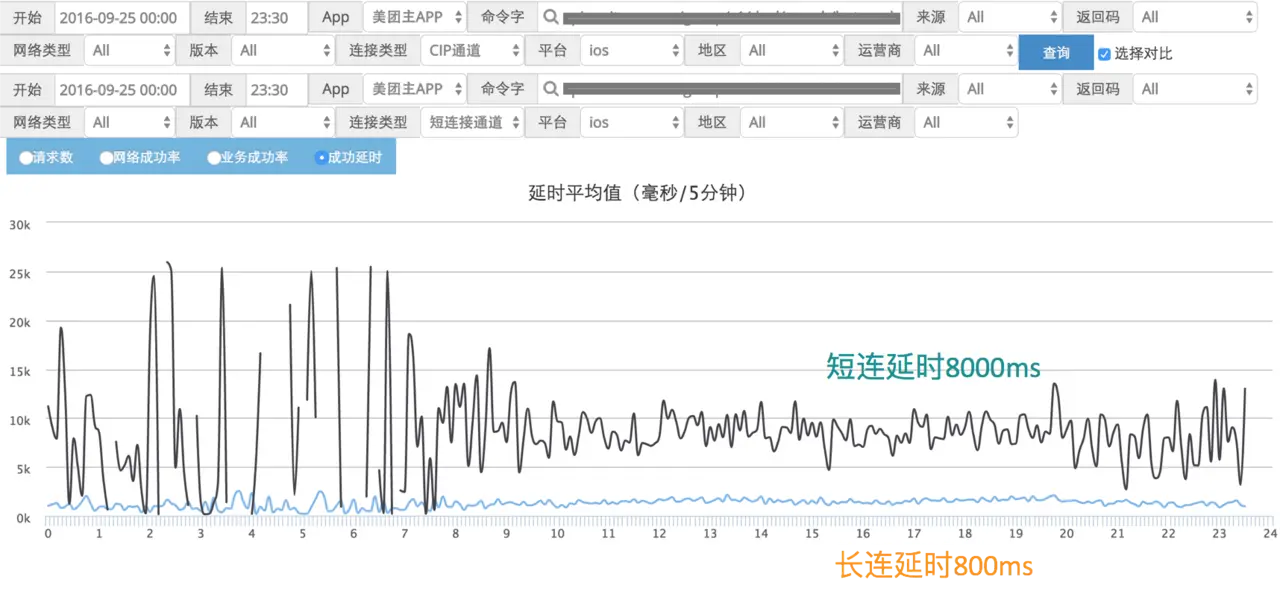 上面两张图片对比了长/短连接的成功率和网络延时数据,这两个是网络模块最重要的衡量指标。可以看出,无论是成功率,还是网络延时,长连接都明显优于短连接。