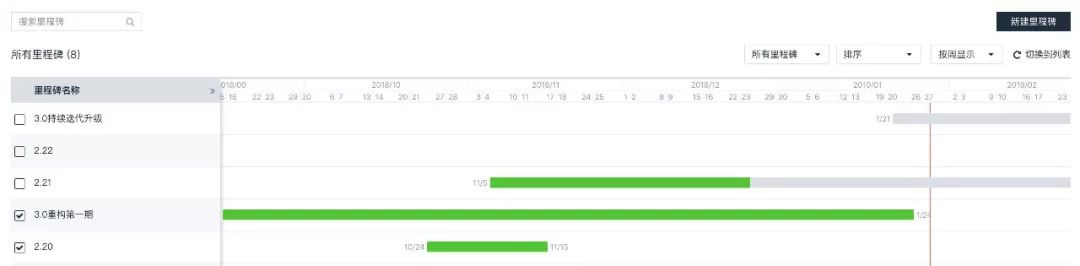 里程碑是我们使用比较多的功能之一。最初,我们使用 CODING 的里程碑来规划版本,比如 1.0 版本对应的里程碑就叫做 1.0,每个任务都是版本中的功能点。后来由于新版本的重构采用了分布式服务化开发,由多个子项目组成。由于各个子项目地版本相对独立导致粒度太细不方便产品的规划,便做了一些调整。目前里程碑主要是用来做长周期的规划,每一个任务都是一个小的项目,由一个或多个人来完成,比如将课件服务 1.1 版本分就单独为一个任务。