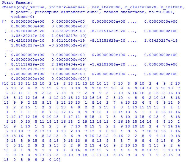 输出如下图所示,20个类簇中心点和408个簇,对应408个景点,每个文档对应聚在相应的类0~19。