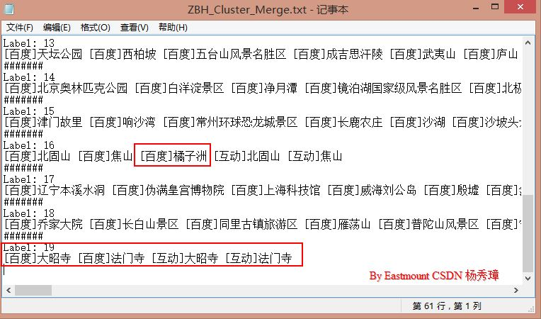 输出结果如下图所示,其中label19可以发现百度百科和互动百科的"大昭寺、法门寺"文本内容都划分为一类,同时也会存在一些错误的类别,如Label15中的"橘子洲"。