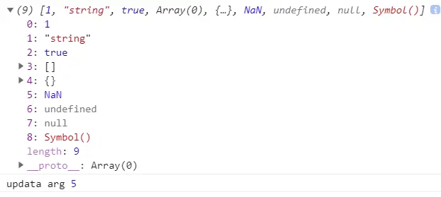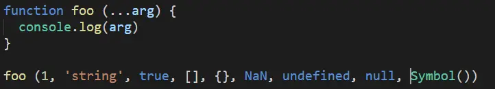 从输出的结果可以看出扩展运算符会把函数调用传入的参数封装到一个数组中输出。