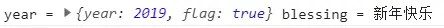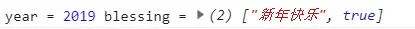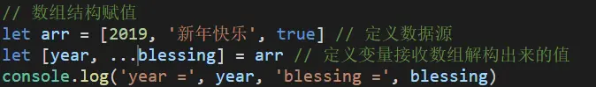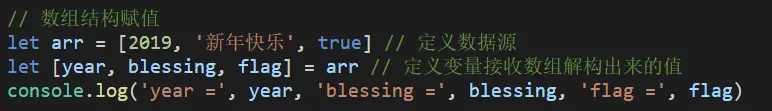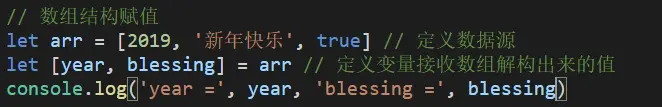 从上面代码不难发现,在 let [year, blessing] = arr 这句话是在执行解构赋值。其year对应的是arr[0]中的值,blessing对应的是arr[1]中的值。左边是通过一个 [ ] 来与右边 arr 数据结构进行对应