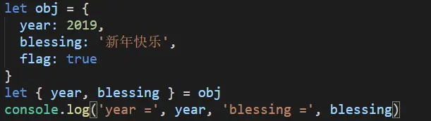 在上面代码中, let {year, blessing } = obj 从数据解构层次上看, 左边的数据结构与右边的数据解构完全一致,都是对象类型的。所以结果为: