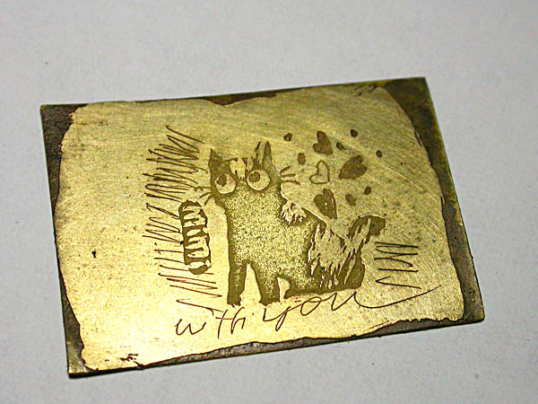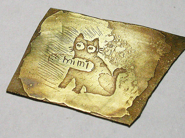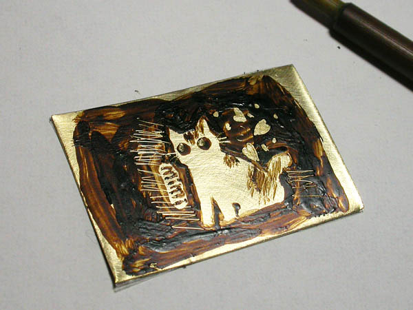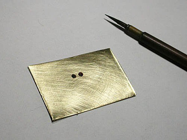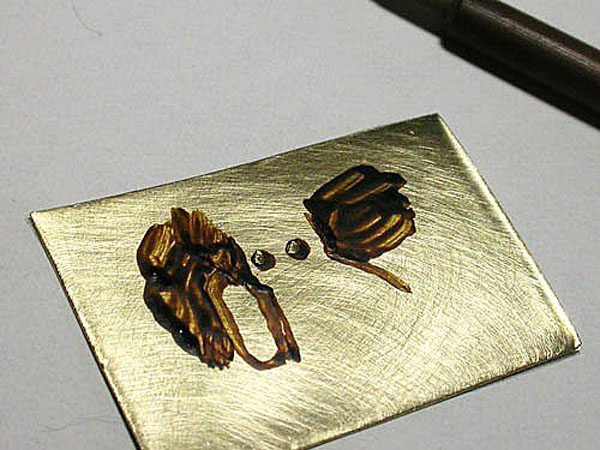 由於是隨意做的,所以連草稿也不用畫,直接用小毛筆沾防蝕液,在銅片上畫兩點,