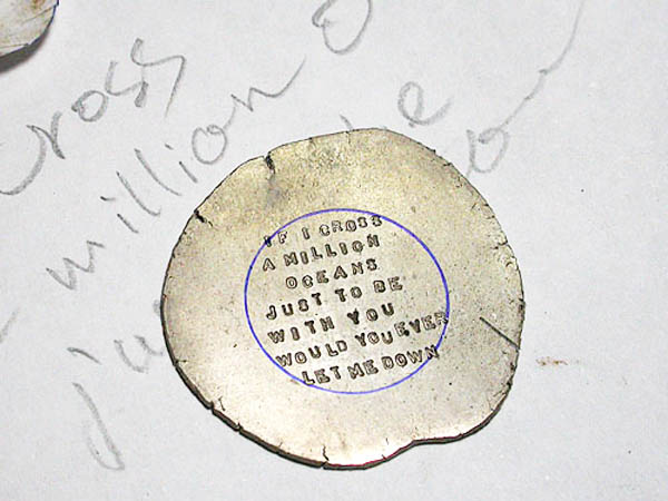 取一片銀片, 用鋼印敲上裝飾的字, 用弓鋸鋸下一個圓片