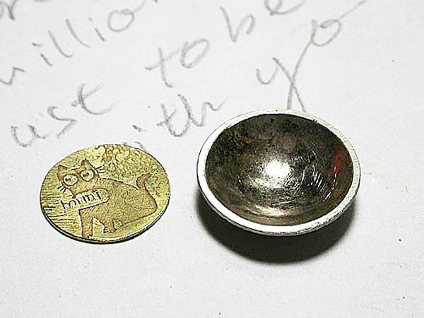 銅片也切成一個圓, 切下來的銀片敲成一個小炒菜鍋