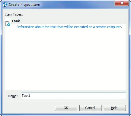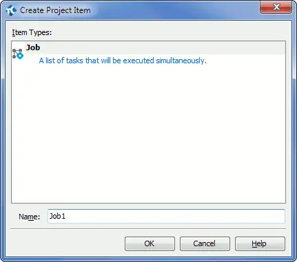 - 将调用Create New Project Item对话框,这将允许您向作业添加新任务。在对话框中为新任务指定在Name编辑框中的名称并单击OK。