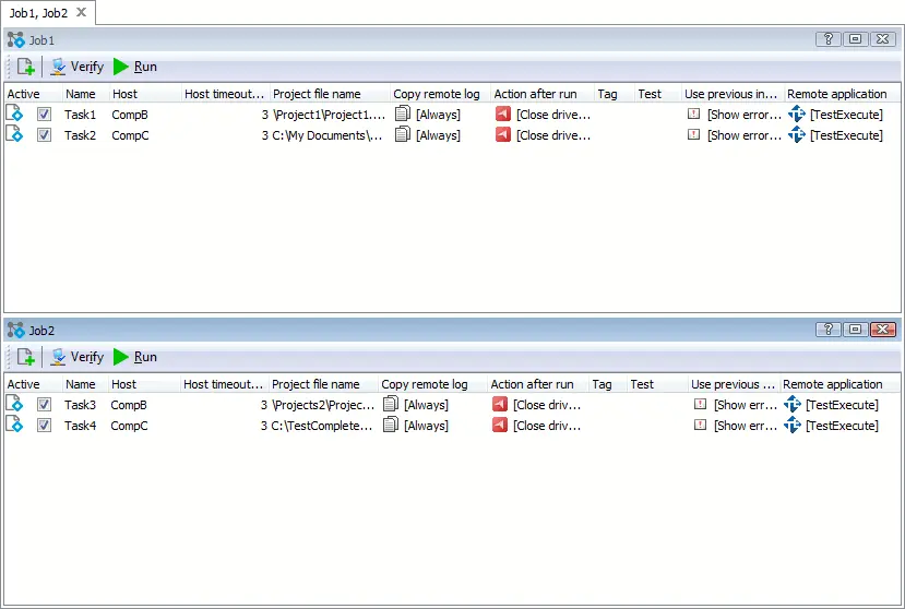 - 在Project file name列中指定\ Project1 \ Project1.mds(没有指定完整的项目路径,因为在CompB主机的Base path属性中指定了此路径的一部分)。在查找项目时,TestComplete将链接基本路径和项目文件名称值。对于Task2,在项目文件名列中指定完整路径C:\ MyDocuments \ Project3 \ Project3.mds(因为未指定CompC主机的基本路径)。