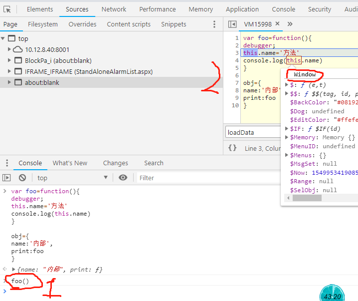 foo() 打印 ‘方法’;如下图,因为直接调用时,this指向的window,